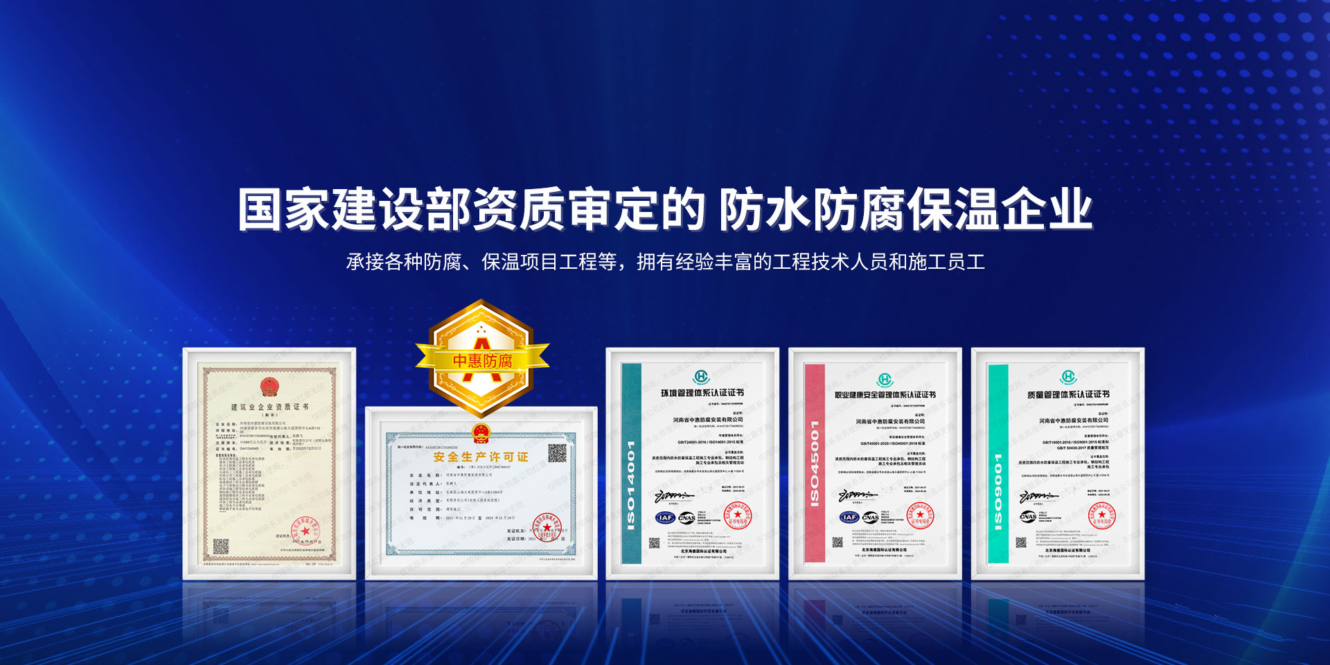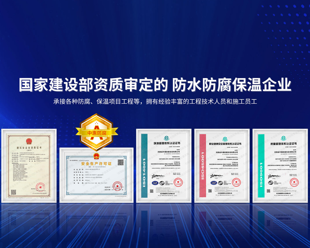 公司經營范圍:防水防腐保溫工程;消防設施工程;建筑裝修裝飾工程;建筑機電安裝工程;電力工程;建筑工程;石油化工工程;工業清洗工程;油罐清洗工程;鋼結構工程;環保工程;模板腳手架工程;電纜防火封堵、防污閃噴涂、外墻外保溫工程;各類施工勞務作業;設備維修、船舶鉚焊、涂裝;電力工程材料、建材、防水材料、防火材料、防腐保溫材料銷售,并相繼通過了GB/T19001-2008idtISO9001:2008GB/T50430-2007質量管理體系認證證書。GB/T24001-2004idtISO14001:2004環境管理體系認證證書。GB/T28001-2011idtOHSAS18001:2007職業健康安全管理體系認證證書。公司是中國防腐蝕于防護協會、中國施工企業管理協會、電力協會和中國鋼結構防水協會會員單位。 公司的經營業務涵蓋了石油、化工、電力、冶金、煤炭、船舶、國防、燃氣、水利、環保、交通運輸、航空及國防軍工和輕紡市政等行業的防腐保溫絕熱設備。鋼結構安裝、防火、防水、金屬噴鍍、聚脲噴繪、陰極保護、防滲透堵漏、玻璃鋼及各種磚版材料襯里、橡膠襯里、煙氣硫和耐酸溶劑腐蝕等工程施工。公司連續十年榮獲“省市先進施工企業”“安全生產先進單位”“重合同,守信用企業”和“AA***資質企業”的稱號。2000年被命名為市級文明單位,2002年被國家工商行政管理局命名為“重合同,守信用的企業”、被中國工業防腐蝕技術協會命名為“防腐蝕企業,能源節約及環境保護領域有豐富的經驗和***的業績。工程一次交驗合格率100%。其中攀枝花鋼鐵公司煉鐵廠四號高爐及熱風爐防腐工程、上海寶鋼公司煤氣柜防腐工程、撫順石油一廠裝置防腐項目、齊魯石化公司稀烴廠高塔防腐工程、吉林化學工業公司煉油廠油罐防腐工程、天津石化熱電廠六號爐頂棚聯絡管保溫工程、大慶油田(太倉)力神泵業工程、中國化學工程第十一建設工程、中原油田勘探局工程、中國石化銷售有限公司華北分部、魯皖輸油管道工程、貴州開磷息烽合成氨工程、陜西黃陵煤化工程、中國石油天然氣西部管道塔里木輸油工程、邯鋼集團邯寶鋼鐵公司煉鐵工程、德州供電工程、吉寶(南通)船廠工程,偃師華潤熱力工程、鄭州熱力總公司。 河南省中惠防腐安裝有限公司愿以豐富的施工經驗,***的技術,***的設備,***的管理,***的服務,竭誠為國內外廣大的用戶提供***滿意、******的工程作品。 我公司愿與國內外同仁一道,團結協作,共同推進防腐蝕行業發展! 公司地址:河南省長垣縣建設路北段360號 固定電話:0373-8866488 郵編:453400 網址:http://www_zhff_com_cn.slmp168.com
